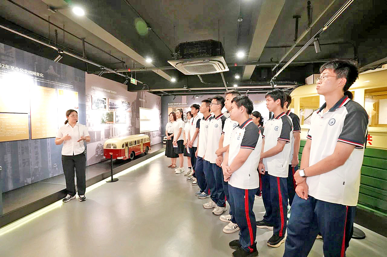 終點(diǎn)站的公交文化展廳,將思政教育推向高潮。從木炭車到新能源車的迭代展陳,見證了廣州公共交通從“人力作業(yè)”邁向“智慧出行”的蝶變。在宣講員的引導(dǎo)下,青年學(xué)子通過(guò)實(shí)物展品觸摸城市發(fā)展軌跡,感悟交通變革背后的奮斗史詩(shī)。